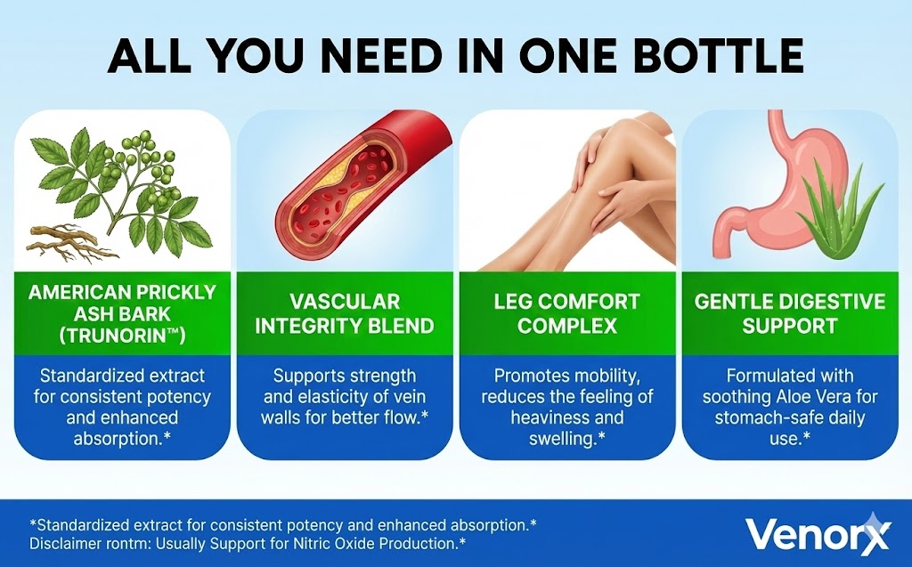 The active ingredient in Venorx is designed to support the body's natural balance of key vascular regulators, including nitric oxide. This dual-action approach helps maintain healthy, relaxed blood vessels and supports optimal circulation